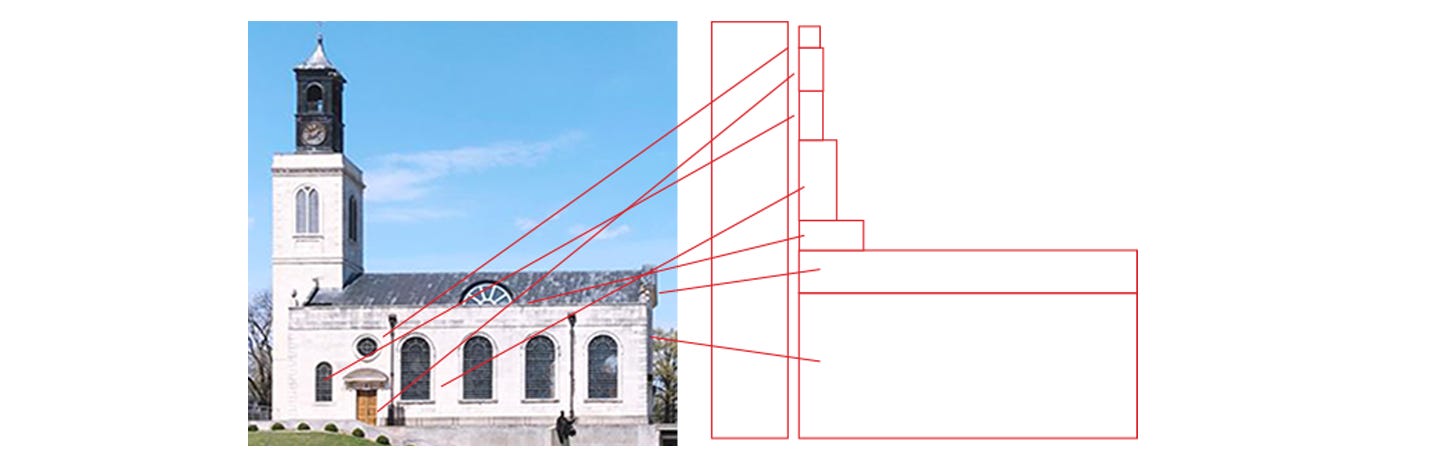 Once I stacked up the proportions of the design elements on the side of the church and compared that to the height of the steeple. They equaled the height of the steeple. I have no idea if that means anything. Like I said, I stared at it for two summers. Nudes, by the way, are way more fun.